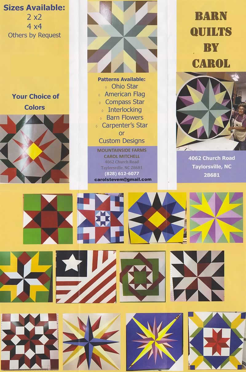 Classes are usually available at the Hiddenite Center on a monthly basis. Just call the Hiddenite Center at 828-632-6966 to learn about my upcoming classes. For more information about ordering Barn Quilt Squares or upcoming classes, please email, text or call 828-612-6077. We at Mountainside Farms are happy to serve you!